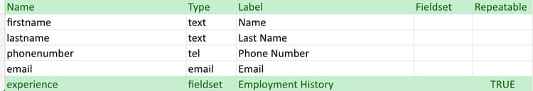 labelför fältet. Det fungerar som rubrik för det repeterbara avsnittet.Se bilden nedan för en illustration av en anställningshistorik i ett ansökningsformulär.