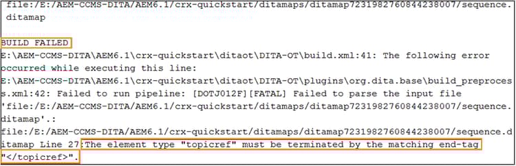 - DITA-mappningsfilrelaterat fel: Om ett fel påträffas i DITA-mappningsfilen eller i någon annan fil som finns i DITA-mappningen innehåller loggfilen strängen "BUILD FAILED". Du kan kontrollera informationen i loggfilen för att hitta den felaktiga filen och åtgärda problemet.