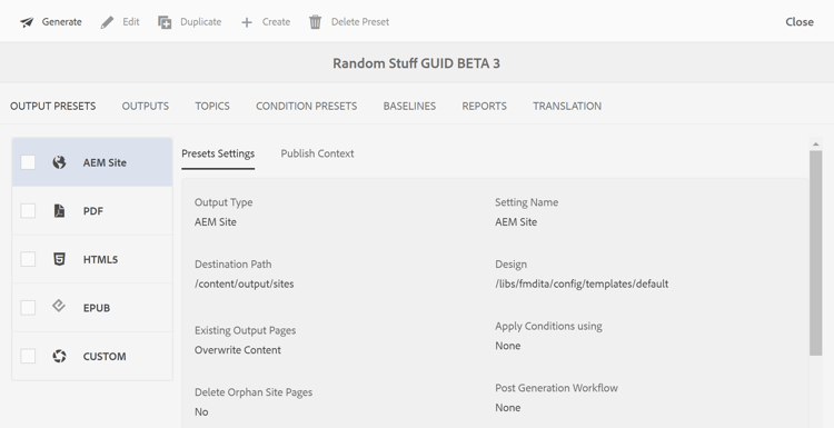 Du kan också generera utdata för en eller flera ämnen från AEM Site, eller hela DITA-kartan från Web Editor. Mer information finns i Artikelbaserad publicering från webbredigeraren.