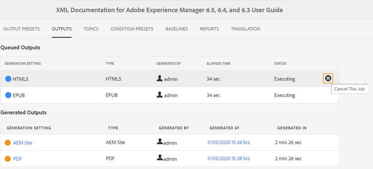 AEM Guides ger utgivaren ett enkelt och enkelt sätt att avbryta alla pågående publiceringsuppgifter. Som utgivare kan du avbryta en pågående publiceringsåtgärd från DITA-kartkonsolen eller Publish Dashboard.