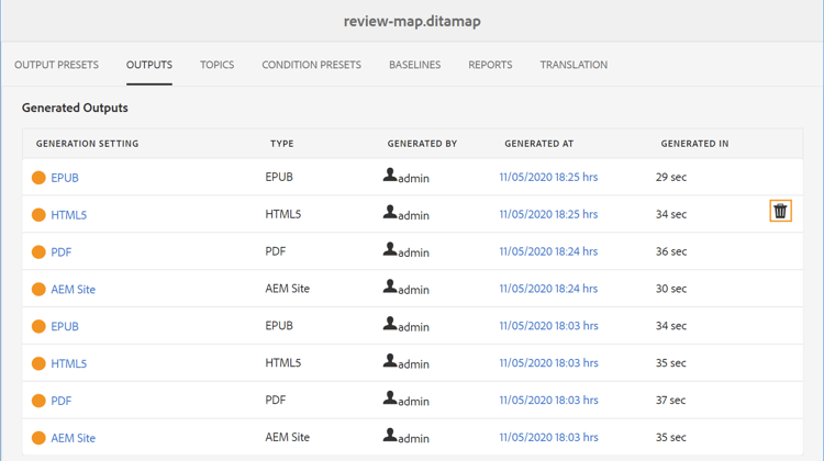 När du genererar flera utdata för en DITA-karta, blir listan Genererade utdata för en sådan karta mycket lång under en tidsperiod. Som utgivare kan du rensa utdatahistoriken för alla mappningsfiler genom att ta bort inaktuella uppgifter från listan Genererade utdata. Observera att utdata inte tas bort från systemet. Det är bara posten för genererade utdata som tas bort från listan Genererade utdata.