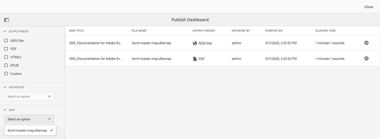 När du har ett stort antal publiceringsuppgifter som körs på datorn blir det praktiskt taget omöjligt att kontrollera varje DITA-karta individuellt för att övervaka dess publiceringsuppgift. AEM Guides ger administratörer och utgivare en enhetlig vy över alla publiceringsuppgifter som körs i systemet. En lista över alla aktiva publiceringsåtgärder finns på Publish Dashboard.