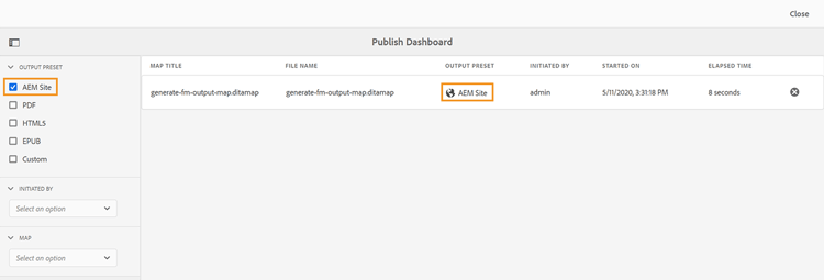 Utdataförinställning - Välj en eller flera förinställningar för vilka du vill se de publiceringsåtgärder som är aktiva. På följande skärmbild filtreras publiceringsaktiviteterna så att endast de uppgifter som använder förinställningen för utdata för AEM Site visas: