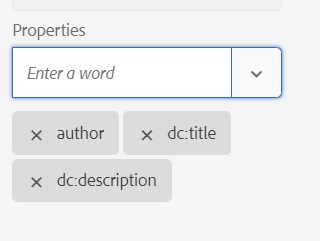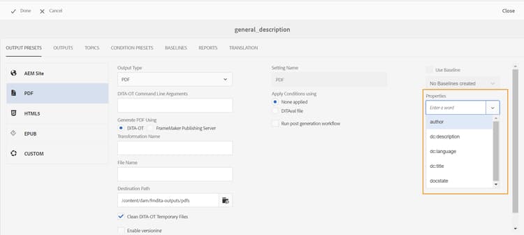 /apps/fmdita/config/metadataList.Mer information om hur du skickar en anpassad egenskap som du redan har definierat värdena för finns i Använd AEM-metadata i DITA-OT PDF-utdata.