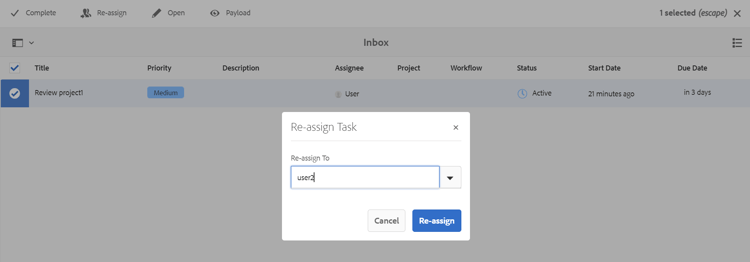 Du kan tilldela en granskningsuppgift som du har tilldelats till en annan användare som har lagts till i samma granskningsprojekt. Det är enkelt att omfördela granskningsuppgifterna från det granskningsmeddelande som visas i inkorgen. Som granskare kan du dock endast omtilldela en granskningsuppgift till enskilda användare och inte till användargrupper med hjälp av meddelanden.