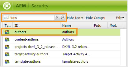 Sök efter användargruppen eller en enskild användare som du vill ge åtkomst till. Om du till exempel vill ge åtkomst till alla användare i gruppen författare anger du författare i fältet Filterfråga och trycker på Retur.