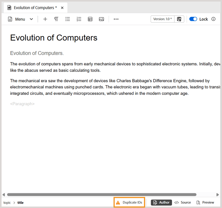 Experience Manager Guides innehåller nu knappen Duplicera ID:n i redigeraren som hjälper dig att snabbt identifiera och korrigera dubblett-ID:n som finns i ett och samma ämne eller karta. När dubblett-ID:n identifieras visas den här knappen längst ned till vänster i redigeringsgränssnittet i redigeringsvyn. När du väljer knappen visas en lista med alla instanser med duplicerade ID:n i en portfölj. Om du väljer en instans markeras motsvarande innehåll i ämnet eller kartan, vilket gör att du kan hitta och korrigera dubblett-ID:n från den högra panelen.