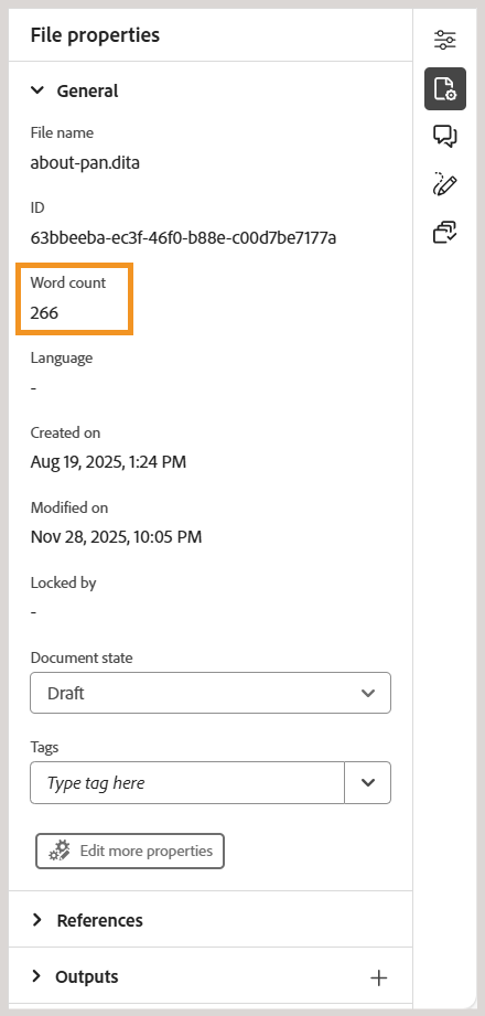Nu kan du spåra antalet ord som finns i en karta eller ämnesfil. Det nya fältet Antal ord i den högra panelen visar det totala antalet ord i ett ämne (eller en karta), där ord avgränsade med blanksteg räknas som enskilda ord. Den uppdateras automatiskt varje gång du sparar ändringar. För korsreferenser inkluderas bara visningstexten, medan tangenter exkluderas.