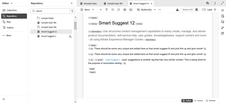 Upplev nu ett renare, effektivare och kraftfullare sätt att skapa markeringsämnen. Experience Manager Guides introducerar ett nytt gränssnitt för markeringsredigering med ett välorganiserat verktygsfält och avancerade funktioner, inklusive en sida vid sida -vy där du kan skapa och förhandsgranska innehåll samtidigt. Det möjliggör också smidig publicering av Markdown-ämnen som är en del av en karta till flera kanaler.