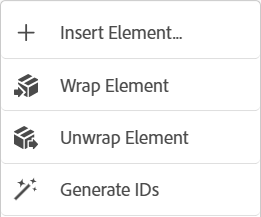 Använd snabbmenyn: Snabbmenyn innehåller alternativ för att klippa ut, kopiera eller klistra in det markerade elementet. Du kan också infoga ett element före eller efter det markerade elementet. Med de andra alternativen kan du generera ett ID eller öppna egenskapspanelen för det markerade elementet.
