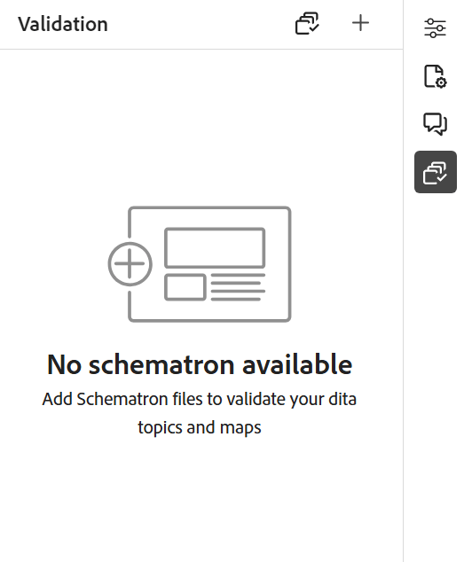 När du öppnar ett ämne i Redigeraren visas en schematrons valideringspanel till höger. Utför följande steg för att lägga till och validera ett ämne eller en karta med en Schematron-fil: