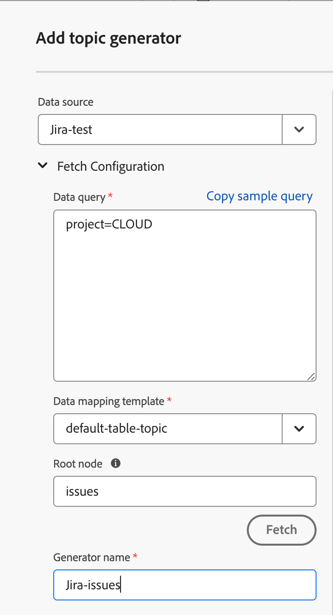 Lägg till datafrågan, datamappningsmallen och rotnodinformationen för ämnesgeneratorn och ge den ett unikt namn på panelen Hämta konfiguration.