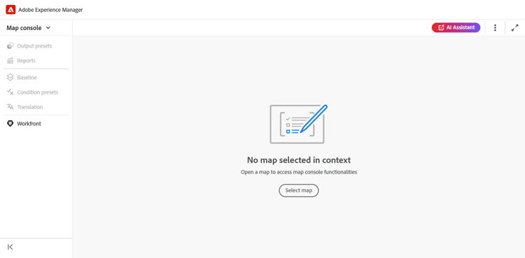 När du har startat kartkonsolen utan att välja någon kartfil visas en tom kartkonsolskärm. Du kan också öppna en kartfil från Experience Manager databas eller dina samlingar.