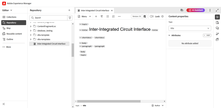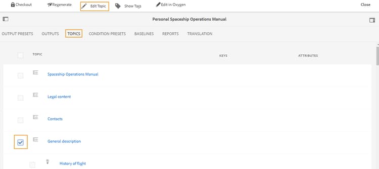 Gå till fliken Ämnen i DITA-kartkonsolen. En lista med ämnen i kartfilen visas.