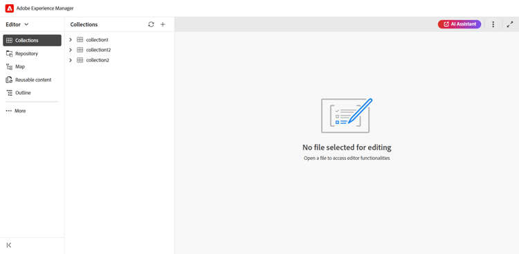 Du kan också starta redigeraren genom att öppna de befintliga filerna i widgeten Senaste filer och widgeten Samlingar i Adobe Experience Manager Guides Home page experience .