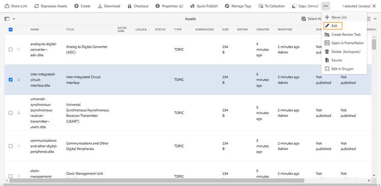 En annan plats där du kan starta redigeraren är från Experience Manager Assets-gränssnittet. Du kan markera ett eller flera ämnen och öppna dem direkt i redigeraren.