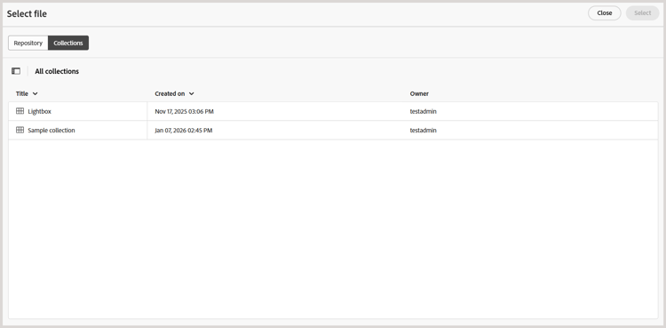 Experience Manager Guides innehåller intuitiva dialogrutor - Välj fil och Välj sökväg - som hjälper dig att effektivt bläddra bland och välja filer eller mappar i innehållsdatabasen.