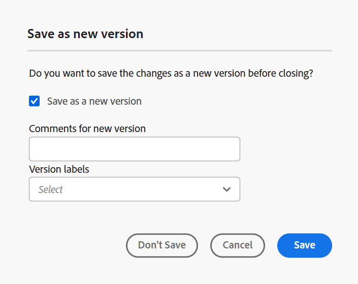 Spara som ny version: Detta sparar ändringarna som du har gjort i innehållet och skapar en ny version av filen. Du kan också lägga till etiketter och kommentarer för den nyligen sparade versionen. Mer information om hur du sparar en ny version finns i Spara som ny version.