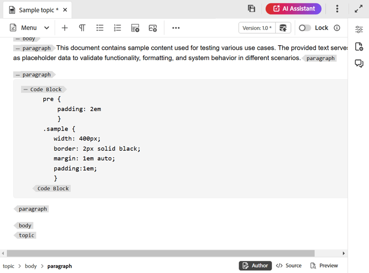 DITA-element som innehåller radbrytningar och blanksteg stöds och återges enligt definitionen i redigeringsläget, Source- eller förhandsgranskningsläget samt i det slutliga publicerade resultatet. På följande skärmbild visas innehållet i elementet msgblock där radbrytningarna och mellanrummen (indrag) har bevarats: