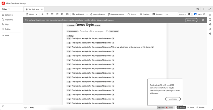 Ett varningsmeddelande visas längst upp för stora filer, vilket visas i utdraget nedan. Den här varningen markerar antalet element baserat på det värde som anges i parametern largeFileTagCount i filen uiconfig.json. Som standard är largeFileTagCount inställt på 2 500.