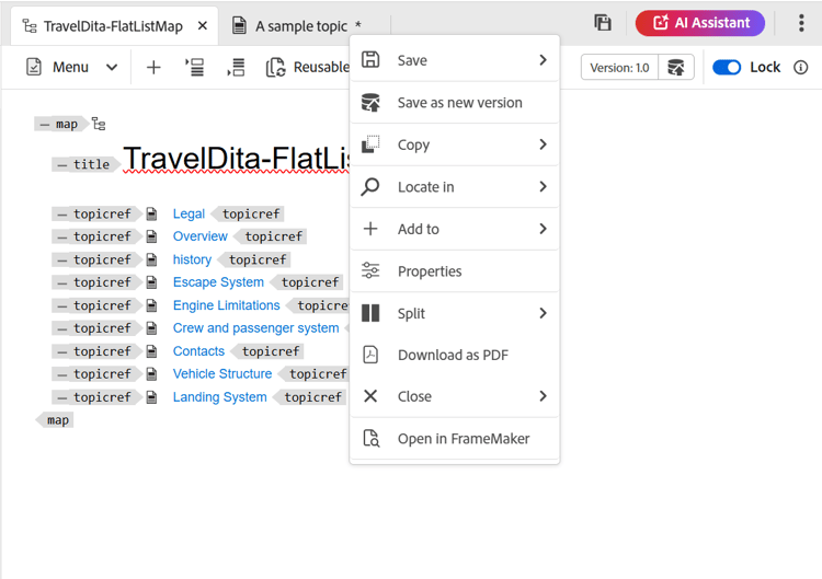 När du försöker stänga en fil som har öppnats i Redigeraren med knappen Stäng på filens flik eller med alternativet Stäng på Alternativ-menyn ber Experience Manager Guides dig att spara ändringarna och låsa upp en låst fil.