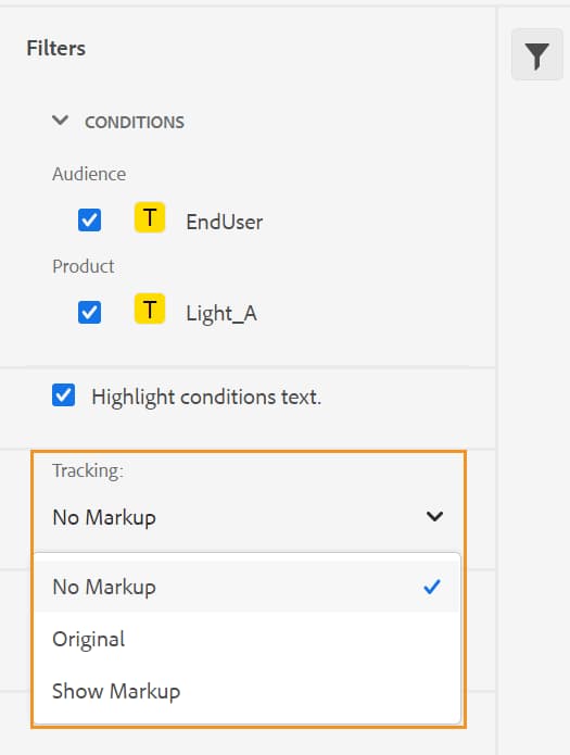 Om ett dokument innehåller spåra ändringar av markeringar (eller visuella tecken) kan du även förhandsgranska dokumentet med eller utan dessa markeringar. När du förhandsgranskar ett dokument innehåller den högra panelen alternativen Filter och Spärra/knip.