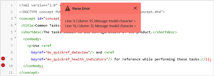 En annan kraftfull funktion i Source-vyn är XML-valideringen i ditt dokument. Om du öppnar ett dokument som innehåller ogiltig XML öppnas det i Source-vyn med information om ogiltig XML. I följande skärmbild visas den exakta informationen om den felaktiga XML:en i popup-fönstret Tolkningsfel.