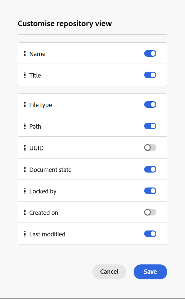 Anpassa: Du kan ändra de kolumner som visas med alternativet Anpassa längst upp till höger i databasvyn. Med det här alternativet kan du visa eller dölja valfri kolumn och även ordna om kolumnerna efter behov. Kolumnerna Namn eller Titel är obligatoriska och båda kan inte inaktiveras tillsammans. Andra fält, till exempel Filtyp, UID, Dokumentläge, Låst av, Skapat den och Ändrat den, kan aktiveras eller inaktiveras efter behov. Du kan ordna om dem genom att helt enkelt dra och släppa.