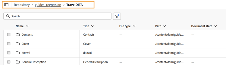 Filtyp: Du kan söka efter alla DITA-avsnitt, DITA-kartor, DITAVAL-filer, Bildfiler, Multimedia, Dokument och JSON.
