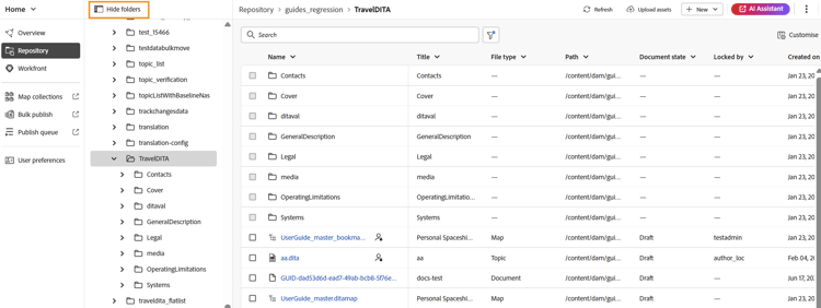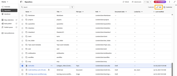 - Nytt: Skapa ett nytt DITA-ämne, en DITA-karta eller en mapp.