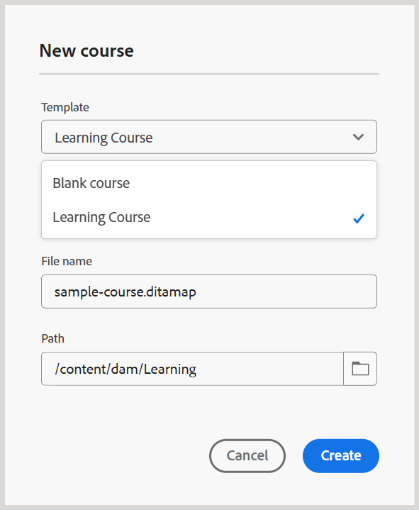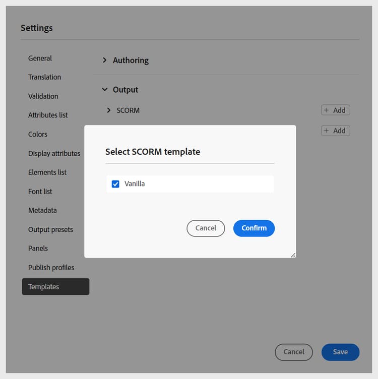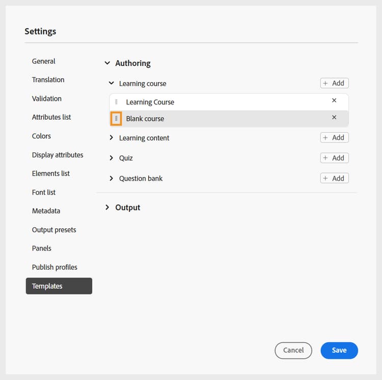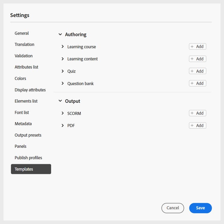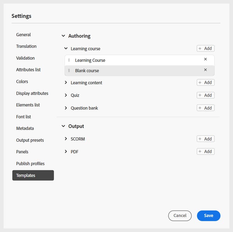 På samma sätt kan du lägga till de andra redigerings- och utdatamallarna. När du har lagt till mallarna blir de tillgängliga för författare och utgivare i deras respektive kursdialogrutor. Den mall för utbildningskurser som lagts till av administratören blir till exempel tillgänglig för författare när de skapar en ny kurs.
