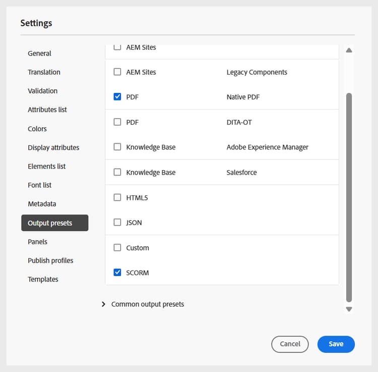 Tillåtna förinställningstyper: I det här avsnittet visas alla förinställningar för utdata som stöds i Experience Manager Guides-instansen. Vid publicering är endast formaten SCORM och PDF tillämpliga. Du kan välja ett eller båda alternativen. De valda förinställningarna är tillgängliga för utgivare när de genererar kursutdata.