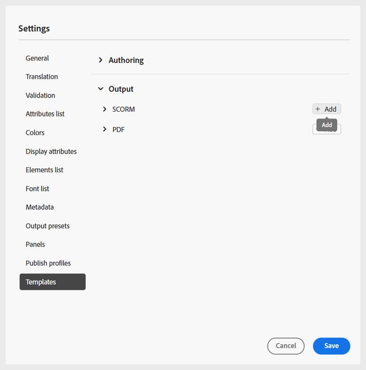 Om du vill komma åt och lägga till utdatamallen för utgivare går du till Inställningar > Mallar > Utdatamallar och väljer Lägg till.