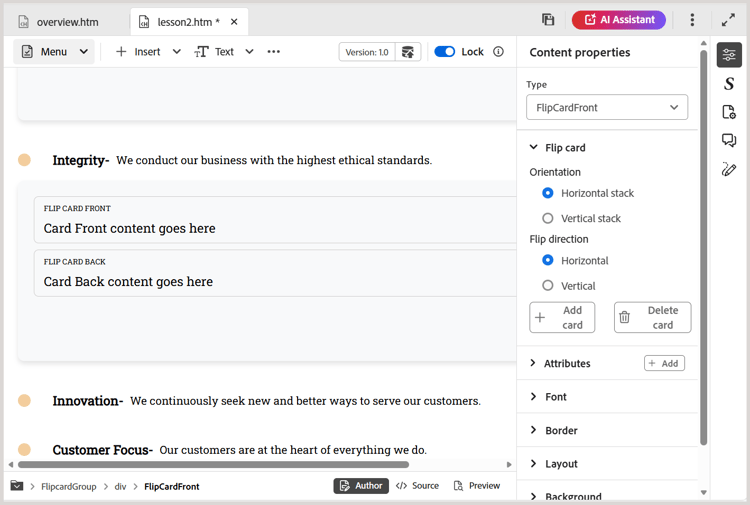 Vänd kort: Lägger till ett interaktivt kort i ditt innehåll som vänds för att visa ytterligare information. Varje kort har två sidor - fram och bak - så att eleverna kan utforska informationen på ett engagerande sätt. Om du vill infoga ett Vänd-kort placerar du markören på önskad plats och navigerar till Infoga > Widget > Vänd kort, som lägger till en Vänd kortbehållare i innehållet. Du kan sedan lägga till en titel och en valfri bild på framsidan och ange motsvarande innehåll på baksidan.
