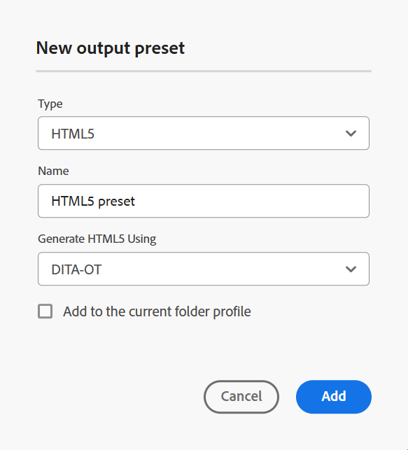Du kan skapa förinställningen för utdata från HTML5 för att publicera utdata med DITA-OT och FMPS (om det har konfigurerats av administratören).