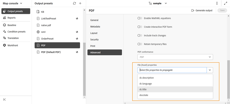 Markera och öppna en förinställning som du vill skicka metadatafälten till. Välj t.ex. PDF förinställning för utdata. Kontrollera att den har skapats med alternativet DITA-OT .