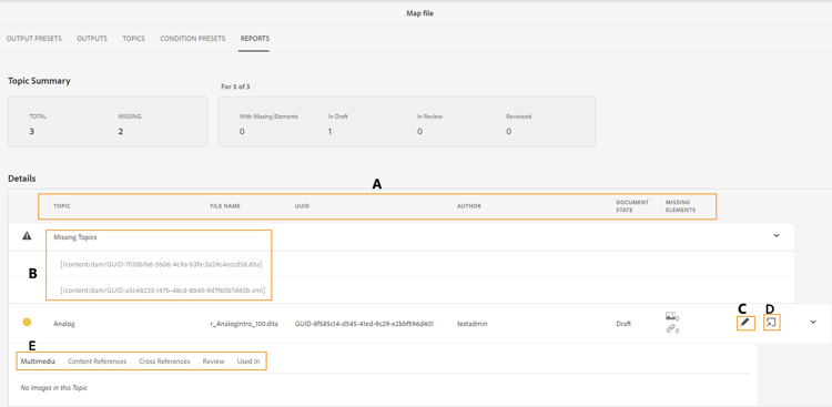 Adobe Experience Manager Guides förser administratörerna med rapporteringsfunktioner för att kontrollera dokumentationens övergripande integritet innan den publiceras eller görs tillgänglig för slutanvändarna. DITA-kartrapporten från kartkontrollpanelen i Experience Manager Guides innehåller värdefull information, t.ex. saknade ämnen, ämnen med saknade element, UUID för refererade ämnen och mediefiler samt granskningsstatus för varje ämne. En detaljerad rapport på individuell ämnesnivå innehåller även DITA-innehållsrelaterad information som innehållsreferenser, saknade bilder eller korsreferenser.