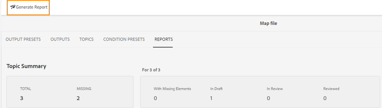 Välj Generera rapport längst upp till vänster för att generera DITA-kartrapporten.