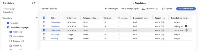 Om du ändrar något i vissa ämnen måste dessa ämnen översättas på nytt. Du kan hålla reda på ändrade ämnen från DITA-kartan. I källmappen för språkkopiering väljer du DITA-mappningsfilen på mappningskonsolen och sedan fliken Översättning. Du kan visa status för varje ämne oavsett om det kräver omöversättning eller inte.