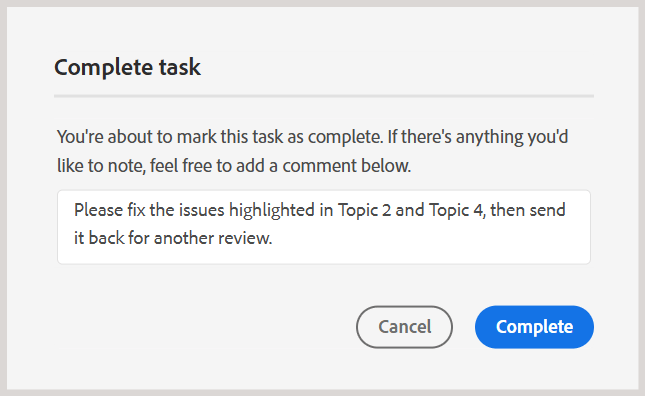 I dialogrutan Slutför uppgift lägger du till de sista kommentarerna för författaren och väljer Fullständig.