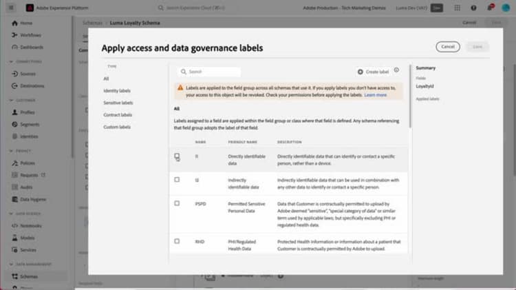 Hantera kunddata och säkerställ att regler, begränsningar och regler som gäller för dataanvändning följs med Adobe Experience Platform Data Governance. Datastyrning spelar en nyckelroll inom Experience Platform på olika nivåer, inklusive katalogisering, datalinje, etikettering av dataanvändning, policyer för dataanvändning och kontroll av användningen av data för marknadsföringsåtgärder.