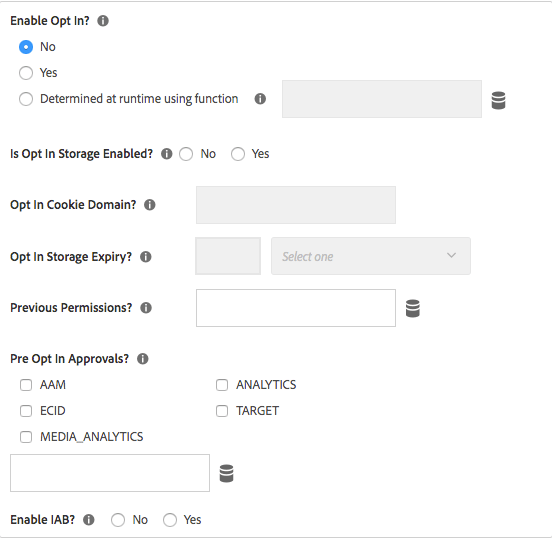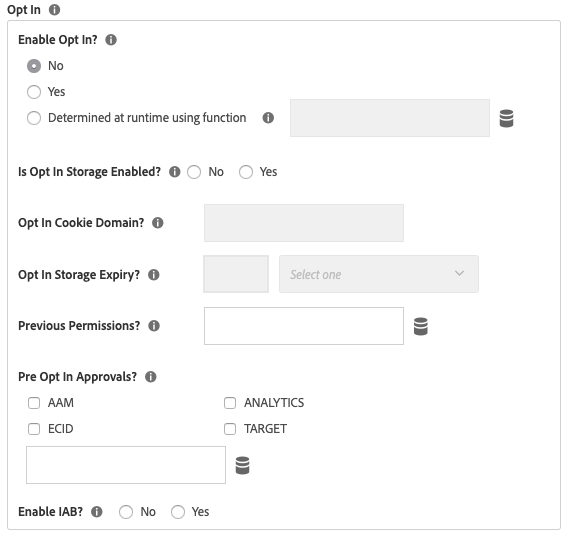 • Ett konfigurationsalternativ för det nya inbyggda Opt-In-objektet har lagts till. Inställningarna kan användas för att undertrycka cookie- och beacon-anrop från Adobe Solutions för att bättre stödja regler som GDPR