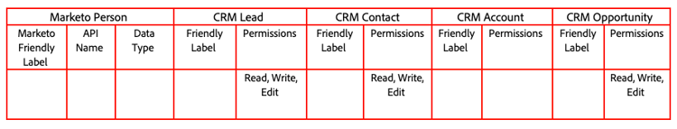 - I efterföljande kolumner upprepar du CRM-objekttyperna (Lead, Contact, Account, Opportunity) med en extra kolumn för den åtkomstnivå som du vill att Marketo Engage ska ha (t.ex. Read, Write, Edit)
