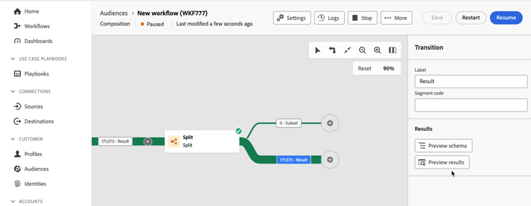 - Förhandsgranska resultat: Du kan välja det här om du vill visa data som transporteras i den valda övergången. Det här alternativet är bara tillgängligt om Behåll resultatet av interimpopulationer mellan två körningar är aktiverat.