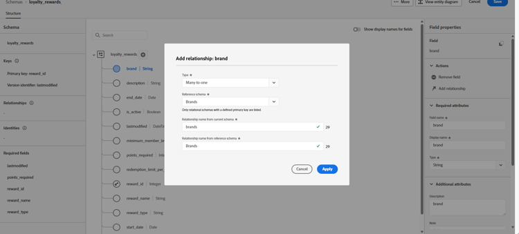 Fortsätt genom att skapa en relation mellan schemat loyalty rewards och schemat Brands för att associera varje belöningspost med rätt varumärke.