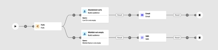 Här är ett exempel på en Orchestrated-kampanj med två Build audience-aktiviteter. Den första målprofilen som innehåller artiklar i kundvagnen, följt av en e-postleverans. Den andra inriktar sig på profiler med en önskelista, följt av en SMS-leverans.