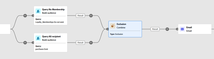 I följande Exclusion-exempel visas två frågor som har konfigurerats för att filtrera profiler som köpt en produkt. De profiler som inte har något lojalitetsmedlemskap exkluderas sedan från den första uppsättningen.