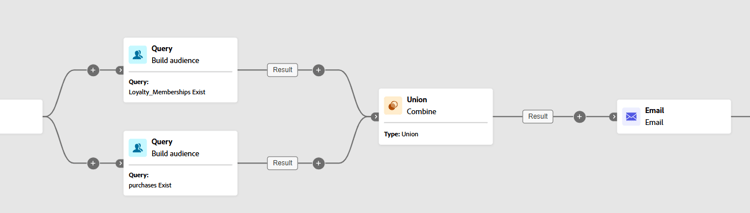 I följande exempel används en Combine-aktivitet med en Union för att sammanfoga resultaten från två frågor, Lojalitetsmedlemmar och Inköpare, till en enda större målgrupp som innehåller alla profiler från båda segmenten.