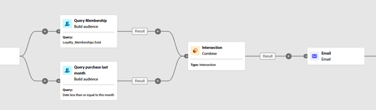 I följande exempel visas hur Intersection används mellan två frågeaktiviteter. Det används för att identifiera profiler som är lojalitetsmedlemmar och som har gjort ett köp under den senaste månaden.