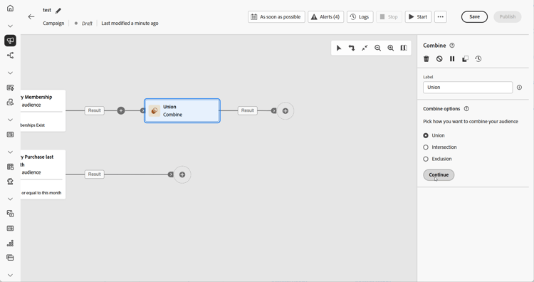 Aktiviteten Combine är en typ av Targeting-aktivitet som gör att du kan segmentera den inkommande populationen effektivt. Det gör att du kan sammanfoga flera populationer, exkludera specifika segment eller behålla endast data som delas över flera mål.